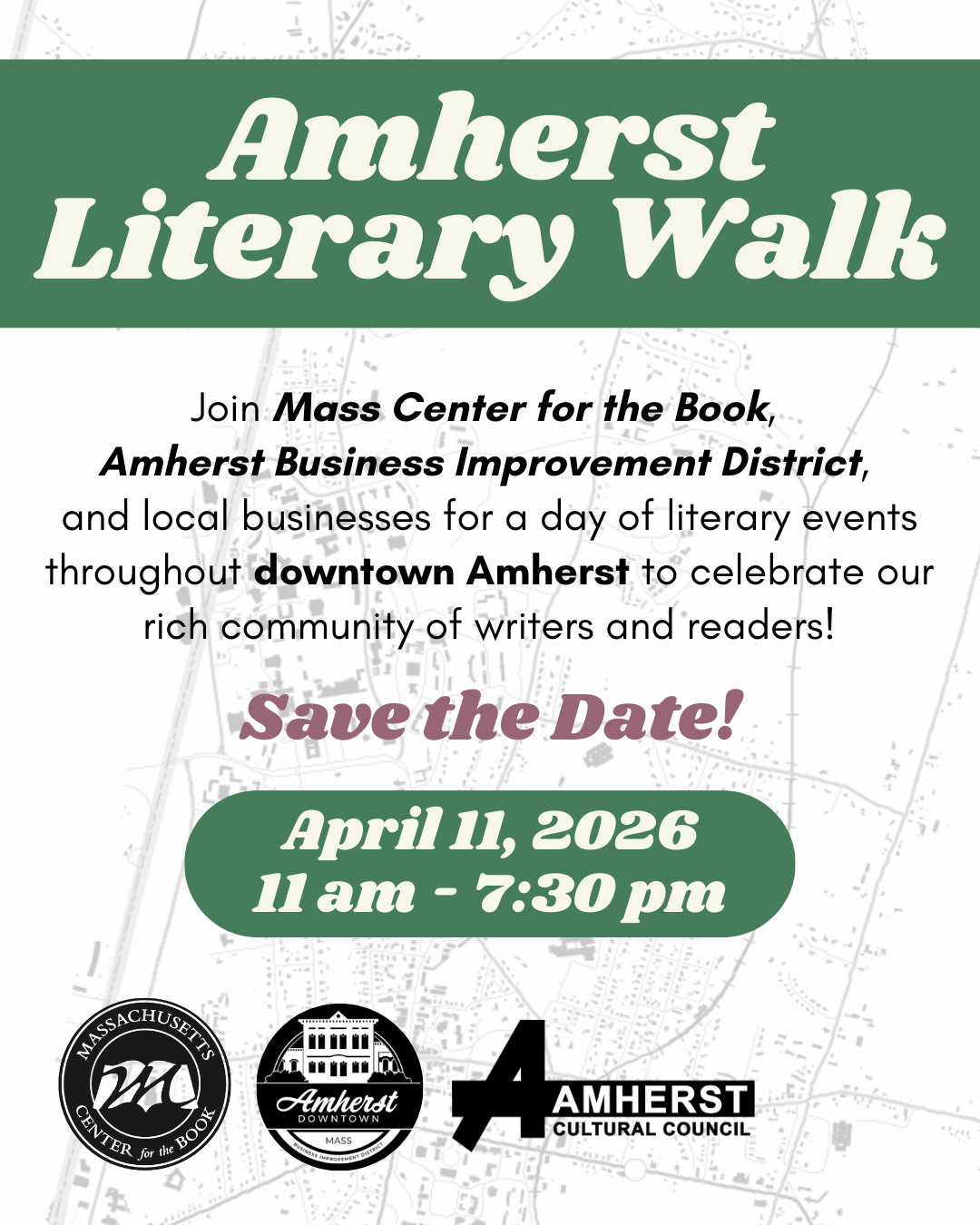 Save the Date and plan on joining us in Downtown Amherst on April 11th for a day of all things literary!
