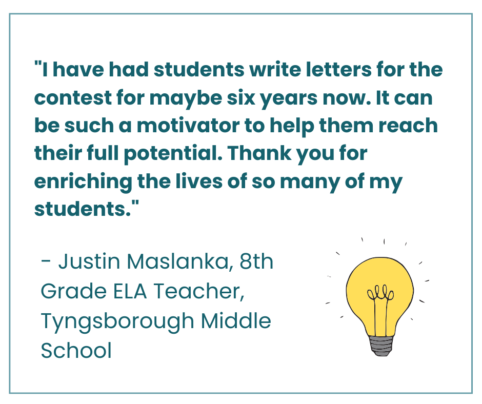 Letters About Literature in Massachusetts is a commonwealth-wide personal and reflective writing initiative sponsored by the Massachusetts Center for the Book. The program invites students in Grades 4 through 12 to read a book of their choice, reflect on it, and write a personal letter to its author, explaining the impact this work had on them.